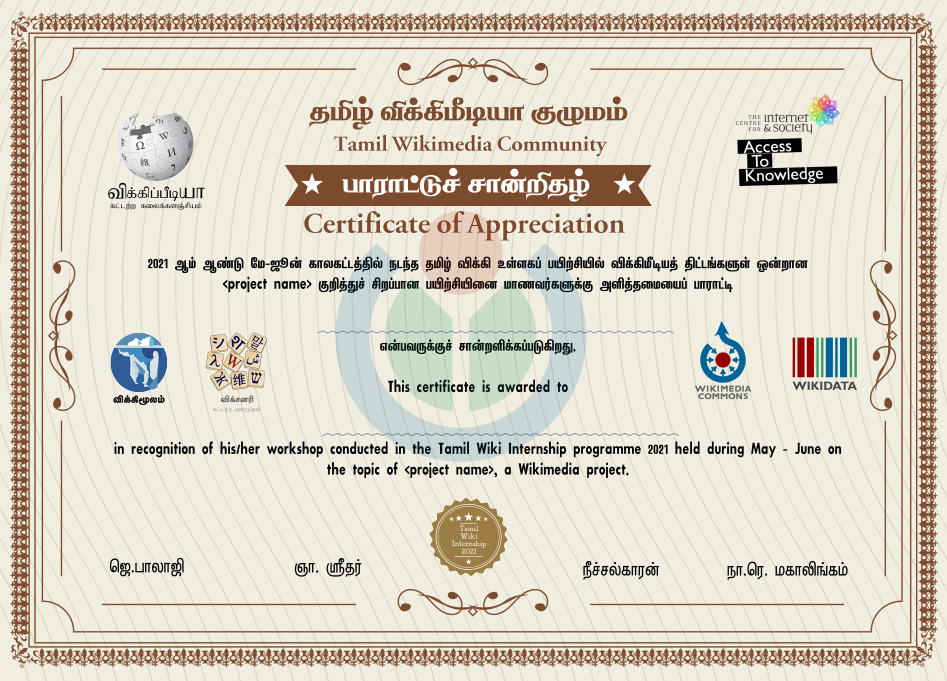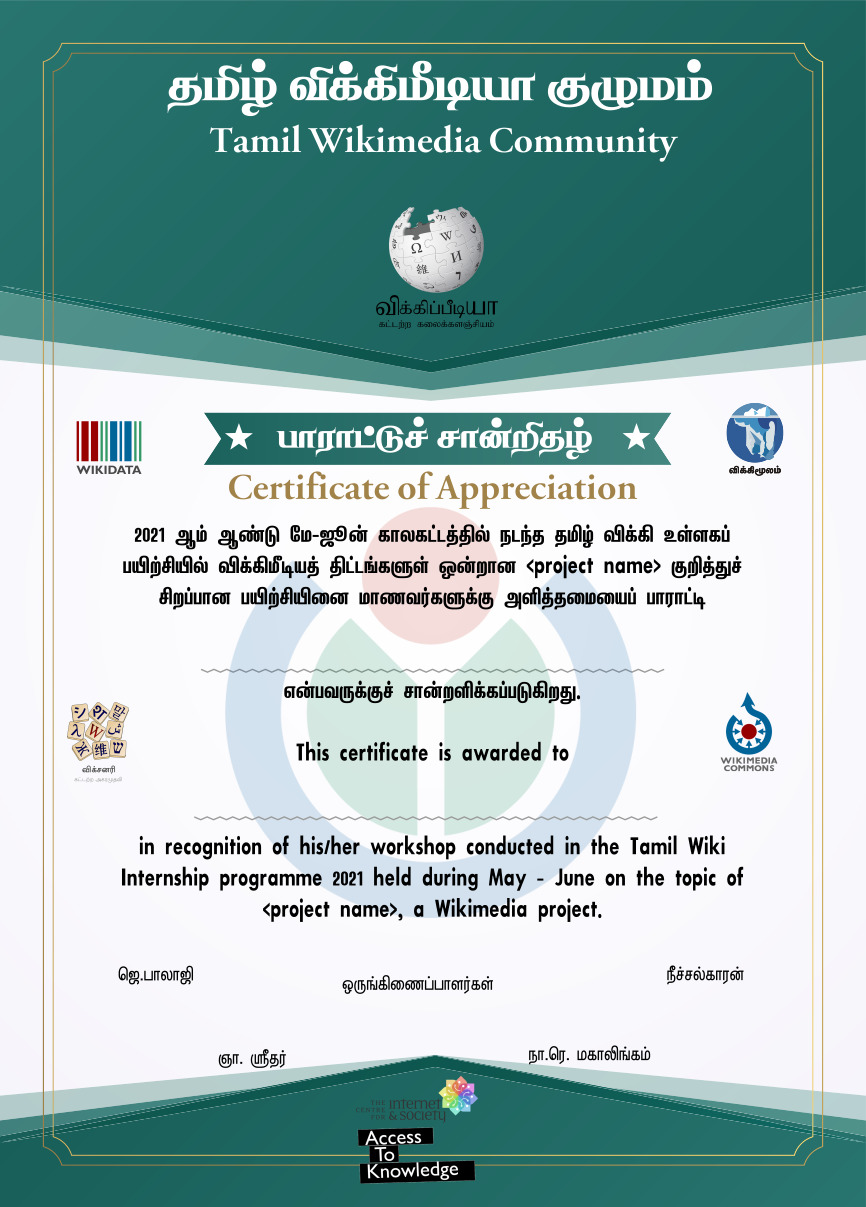 தமிழ் விக்கிமீடியா குழுமம் Tamil Wikimedia Community பாராட்டுச் சான்றிதழ் Certificate of Appreciation 2021 ஆம் ஆண்டு மே-சூன் காலகட்டத்தில் நடந்த தமிழ் விக்கி உள்ளகப் பயிற்சியில் விக்கிமீடியத் திட்டங்களுள் ஒன்றான <project name> குறித்துச் சிறப்பான பயிற்சியினை மாணவர்களுக்கு அளித்தமையைப் பாராட்டி <name> என்பவருக்குச் சான்றளிக்கப்படுகிறது. This certificate is awarded to <name> in recognition of his/her workshop conducted in the Tamil Wiki Internship programme 2021 held during May - June on the topic of <project name>, a Wikimedia project. ஞா. ஸ்ரீதர் நா. ரெ. மகாலிங்கம் ஜெ. பாலாஜி நீச்சல்காரன் ஒருங்கிணைப்பாளர்கள்